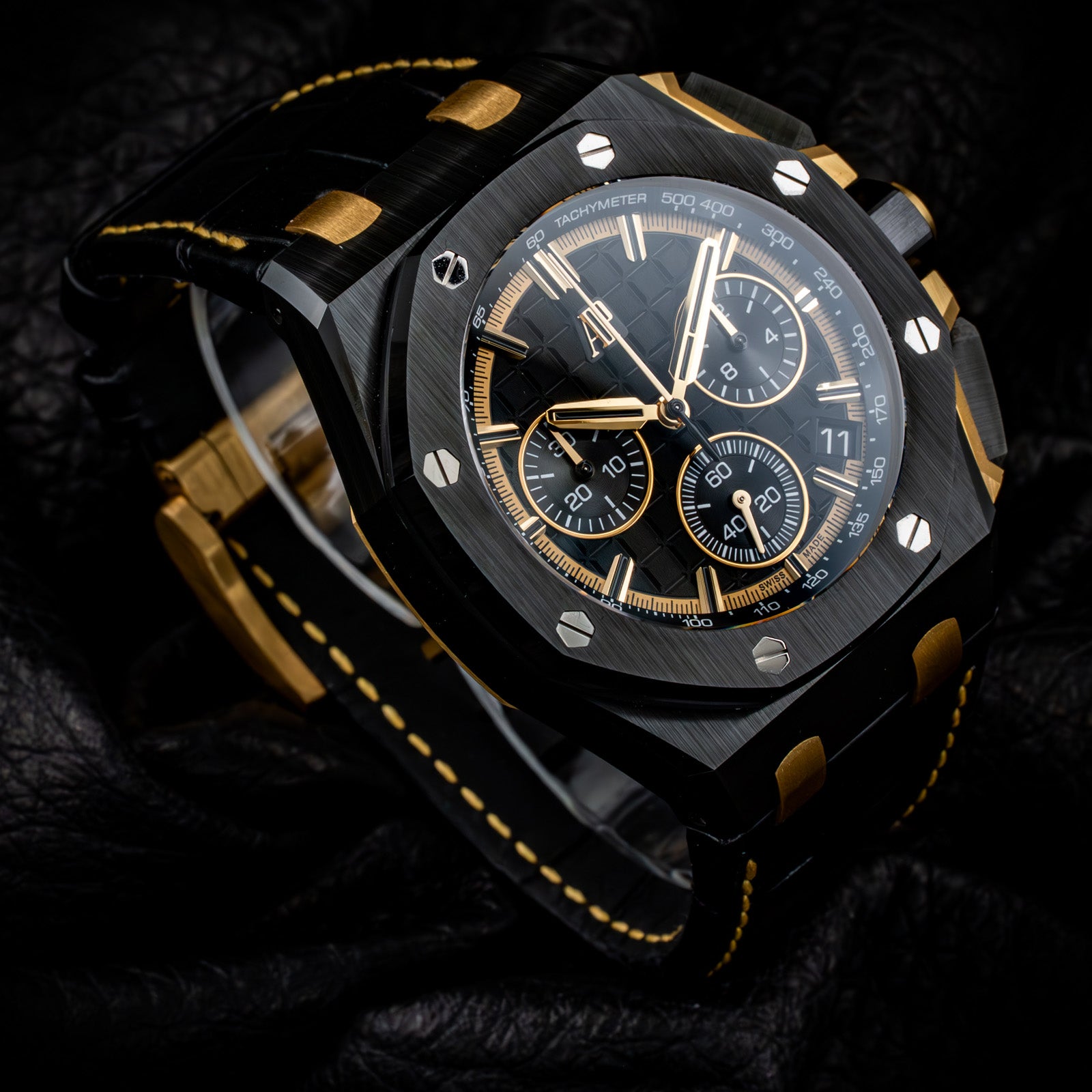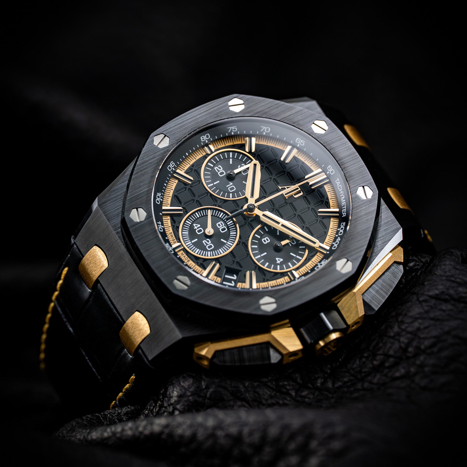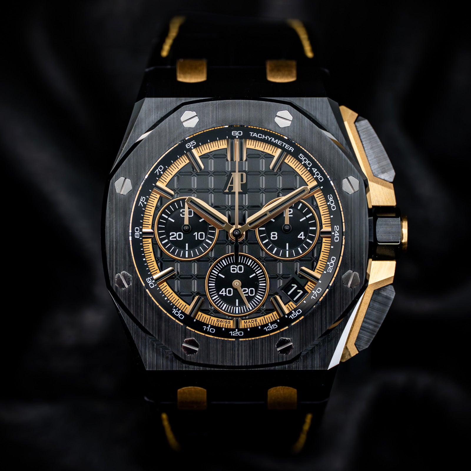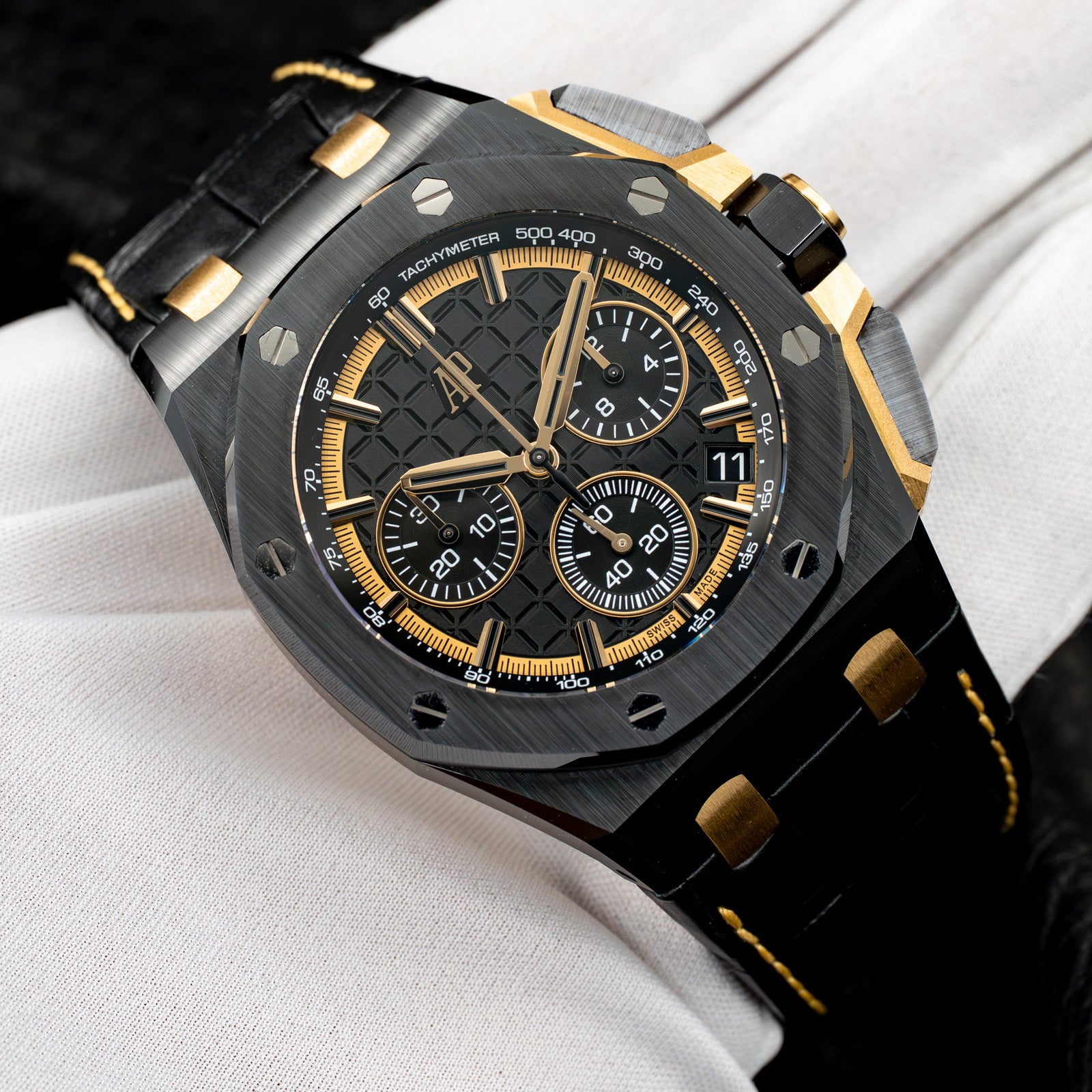 This is not just a chronograph. It's a declaration of power. Forged from deep black ceramic and supercharged with bold yellow gold accents, the Royal Oak Offshore 26420CE.OO.A127CR.01 is a force of nature on the wrist. Every angle radiates confidence, from the muscular 43mm case to the signature "Méga Tapisserie" dial pulsing beneath sapphire crystal.