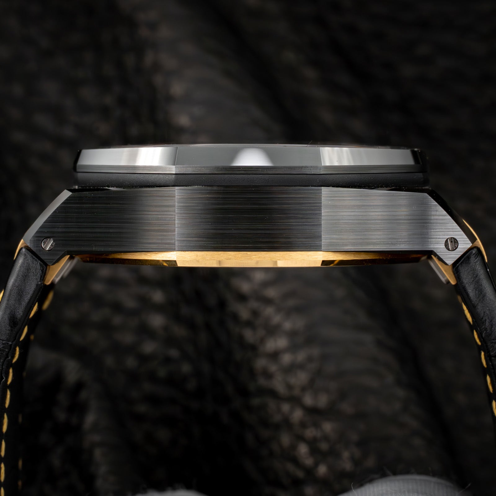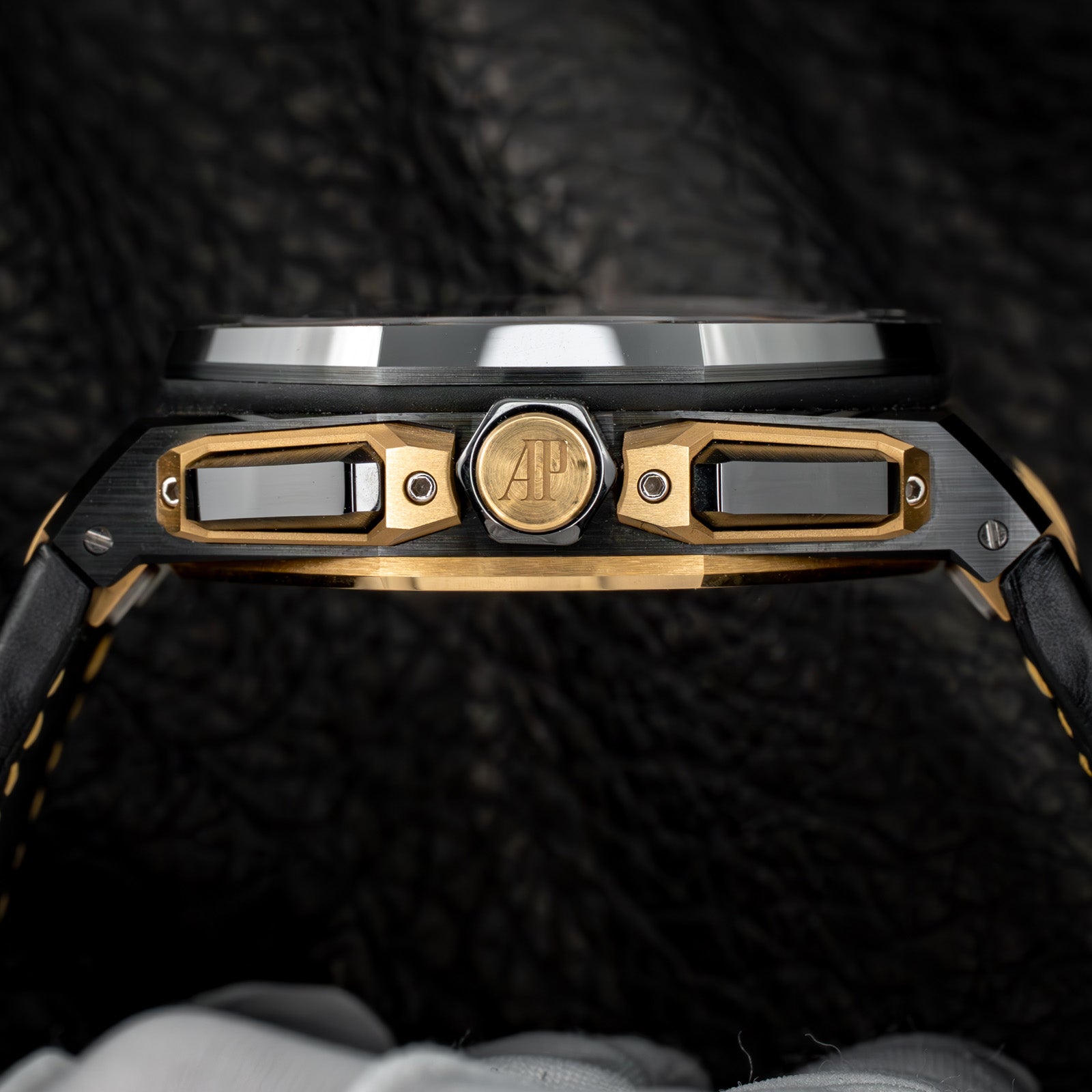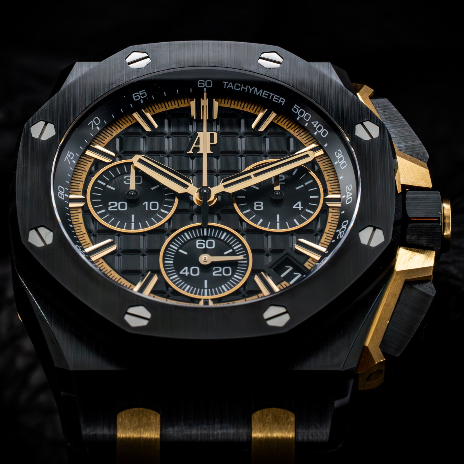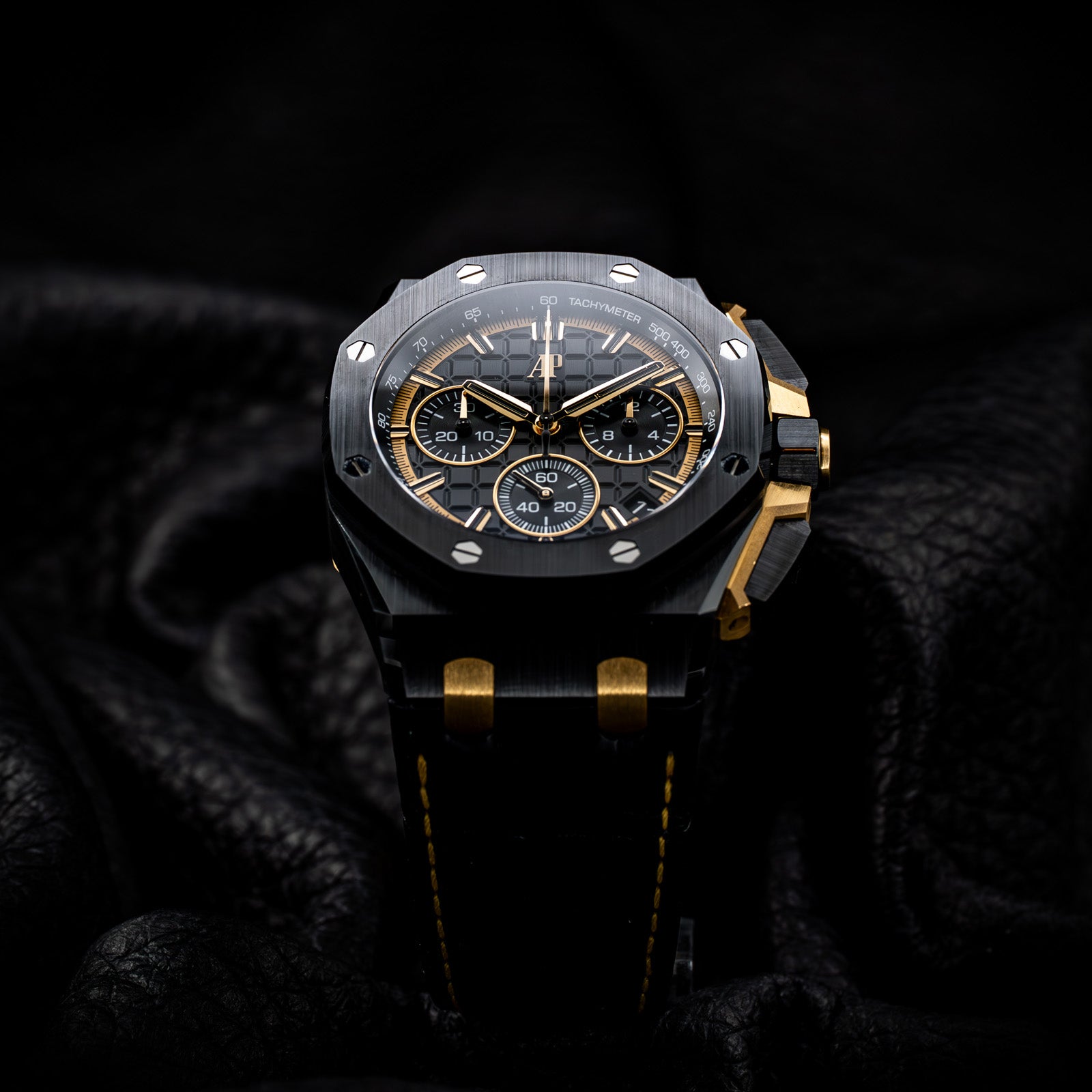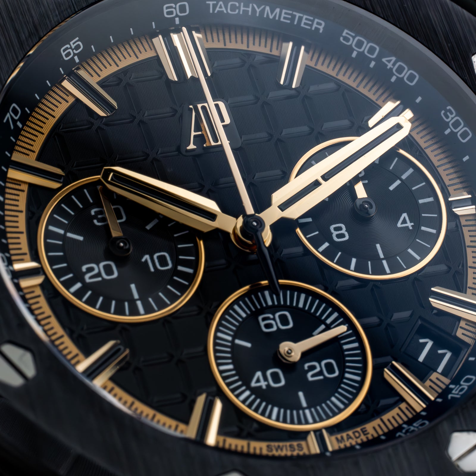 This is not just a chronograph. It's a declaration of power. Forged from deep black ceramic and supercharged with bold yellow gold accents, the Royal Oak Offshore 26420CE.OO.A127CR.01 is a force of nature on the wrist. Every angle radiates confidence, from the muscular 43mm case to the signature "Méga Tapisserie" dial pulsing beneath sapphire crystal.