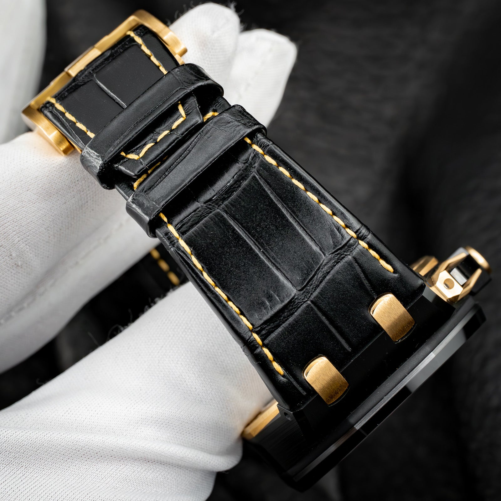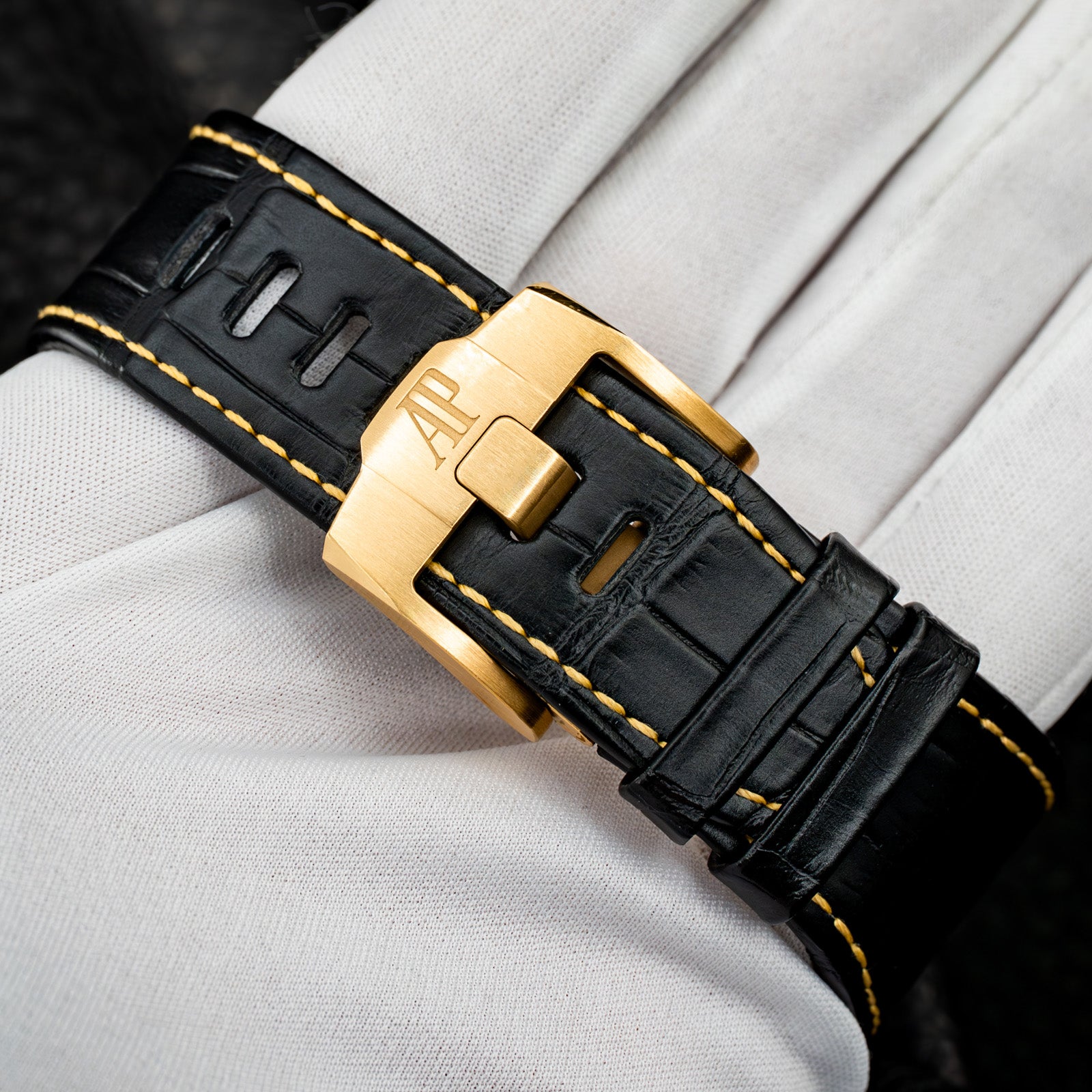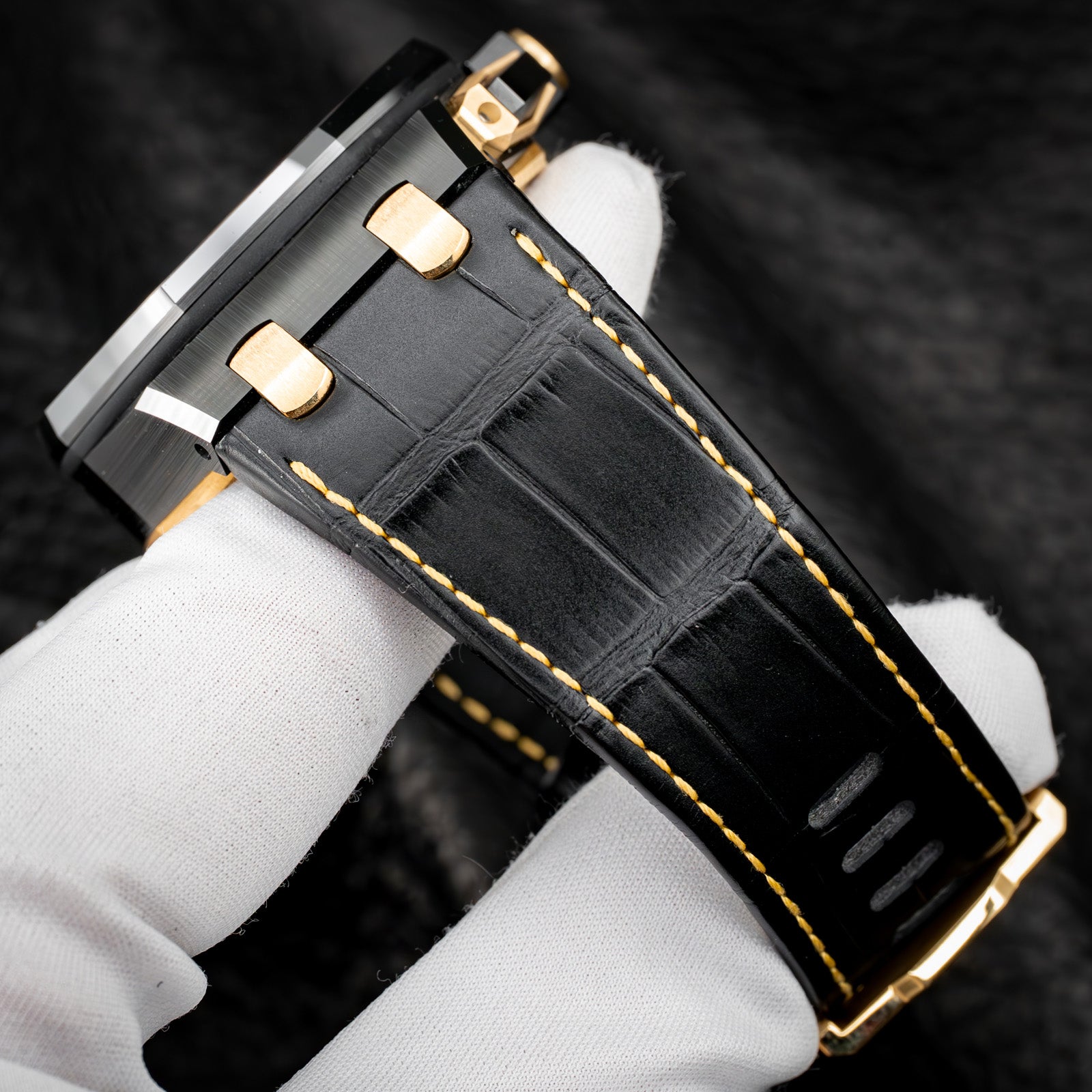 The flyback chronograph comes alive with the Caliber 4401, a movement as precise as it is powerful with a 70-hour reserve. Paired with a fierce alligator strap and built with serious water resistance, this is the Offshore reimagined for those who live on the edge.