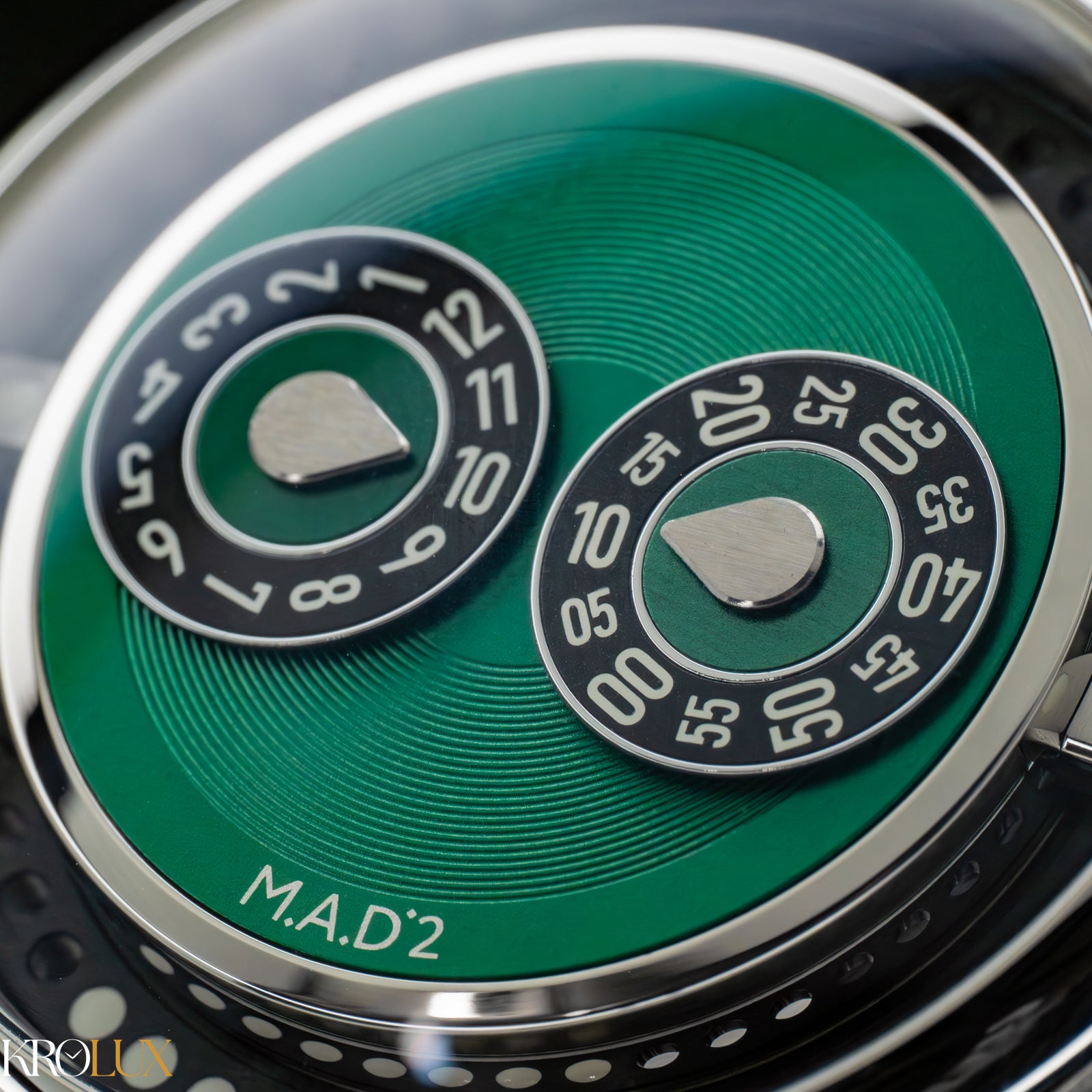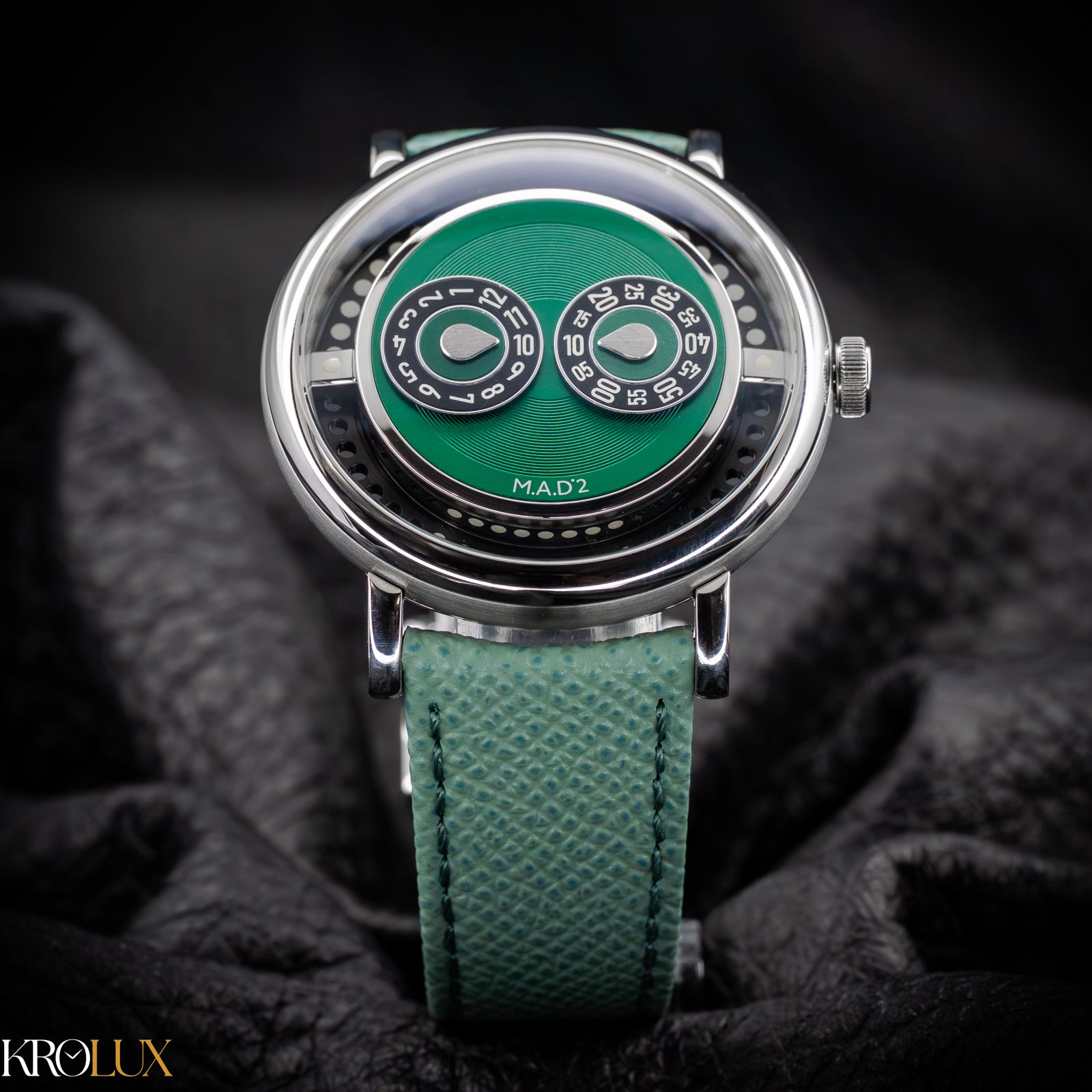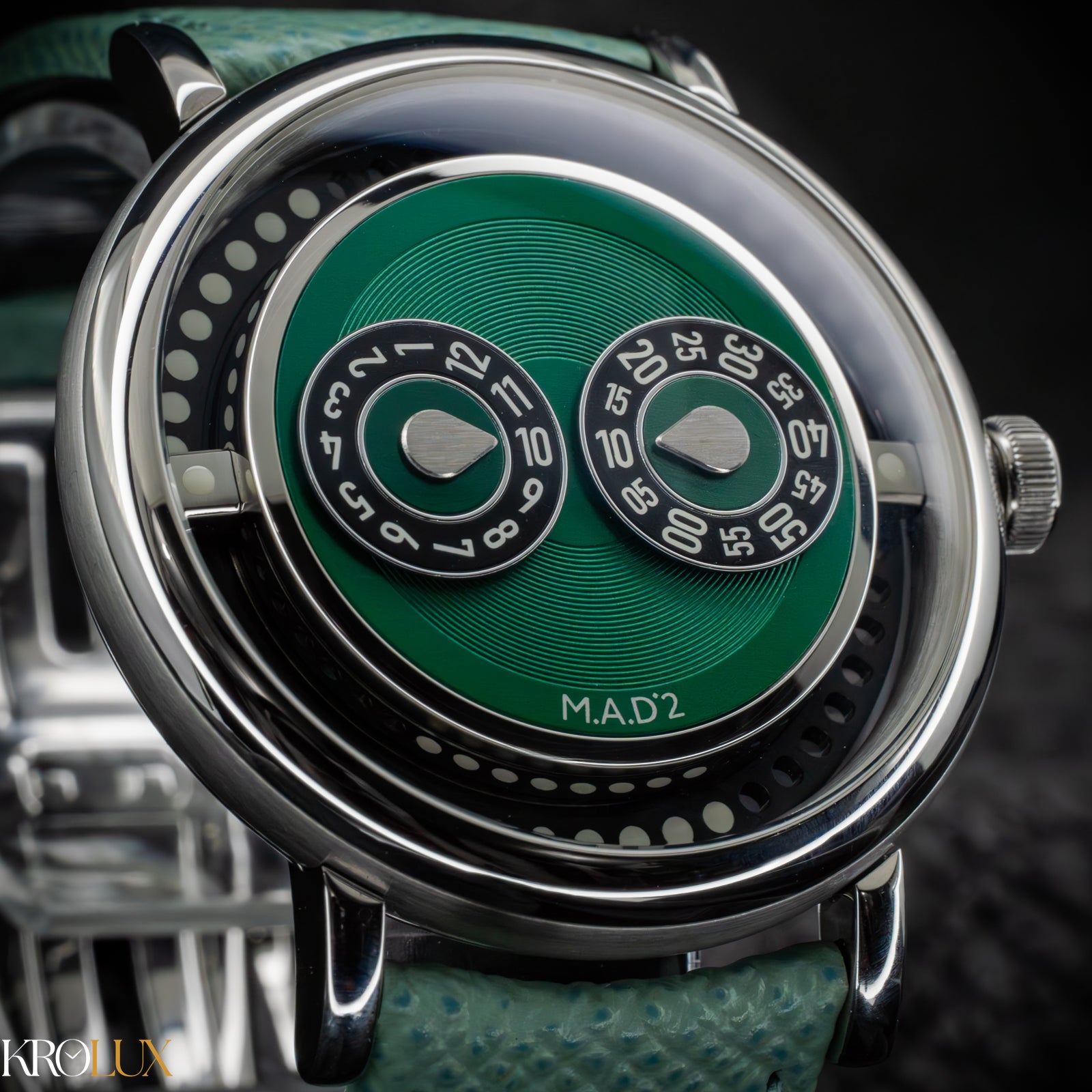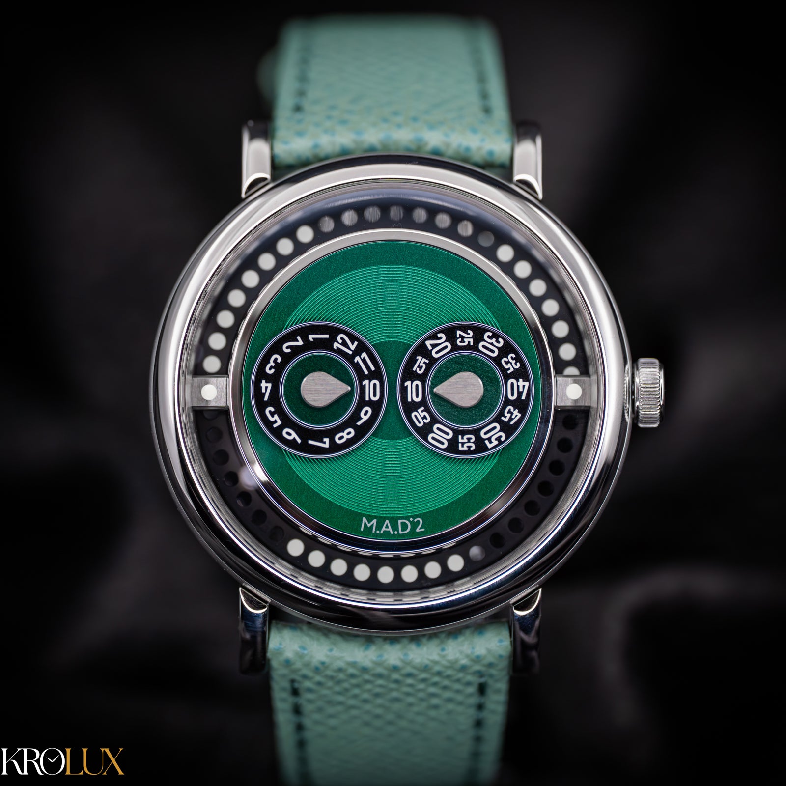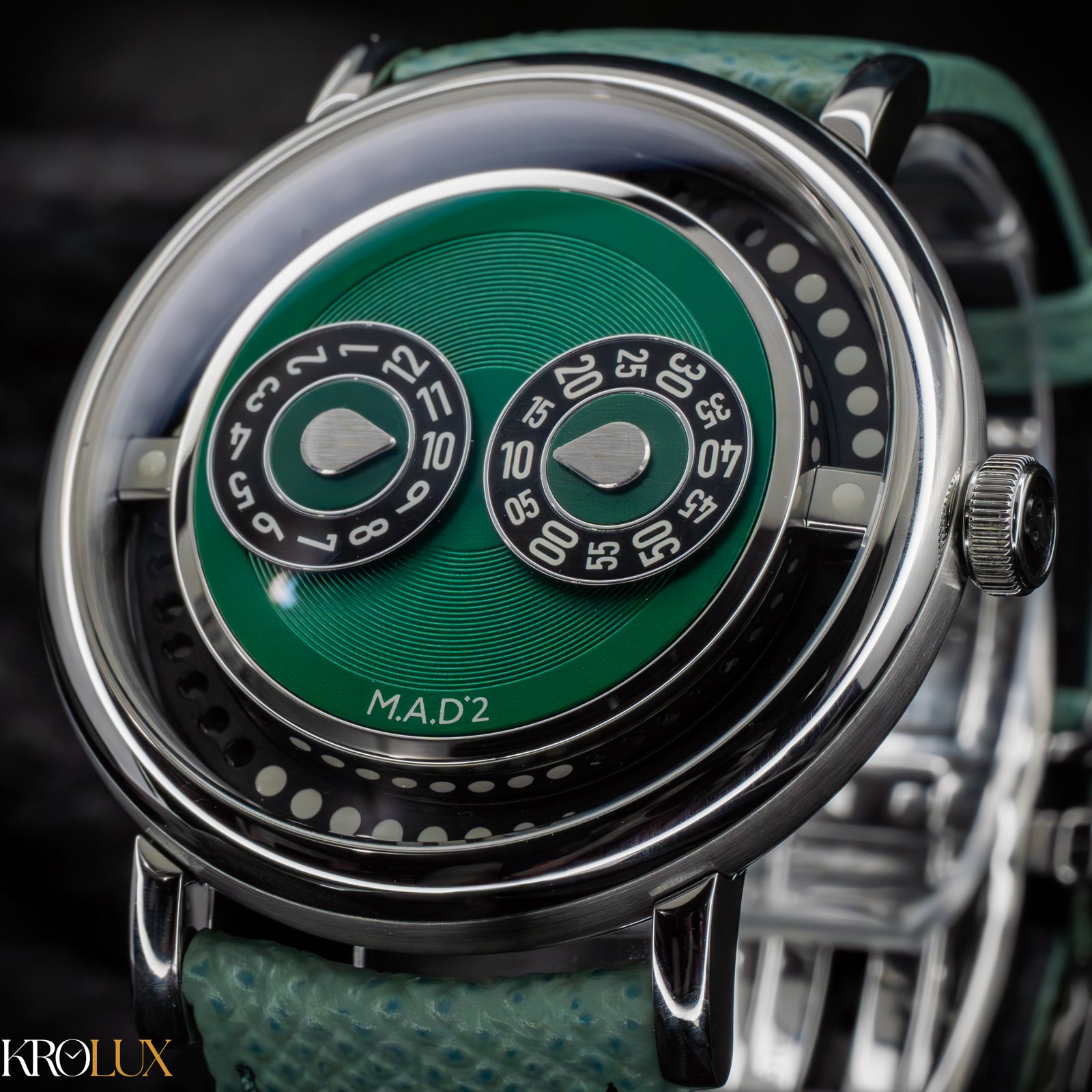 The MB&F M.A.D.2 Green Edition is playful horology brought to life. Its stainless steel case frames a striking green dial where rotating discs display the hours and minutes in a way that feels futuristic and unconventional. The bold circular pattern and twin registers create a design that is instantly recognizable, almost like a mechanical smile staring back at you.