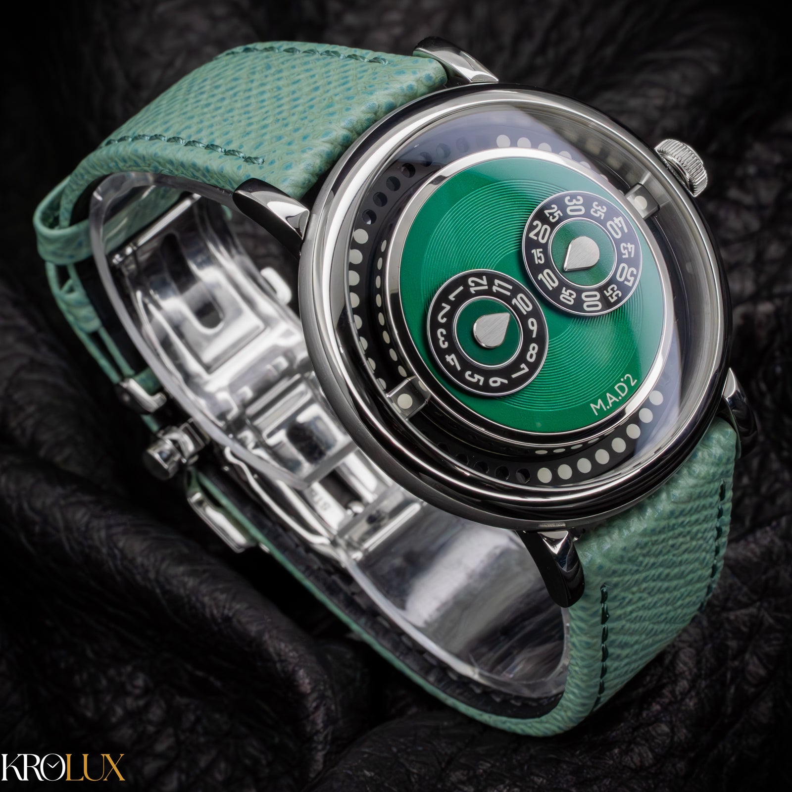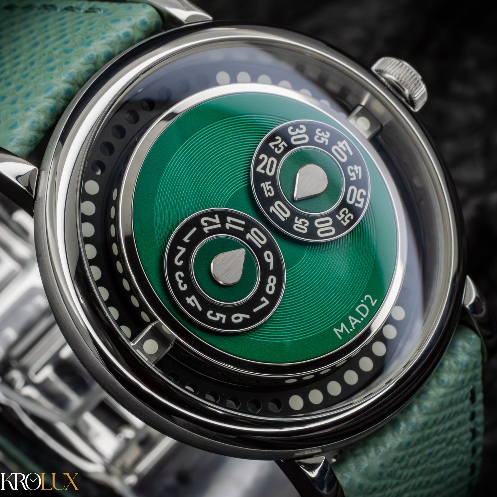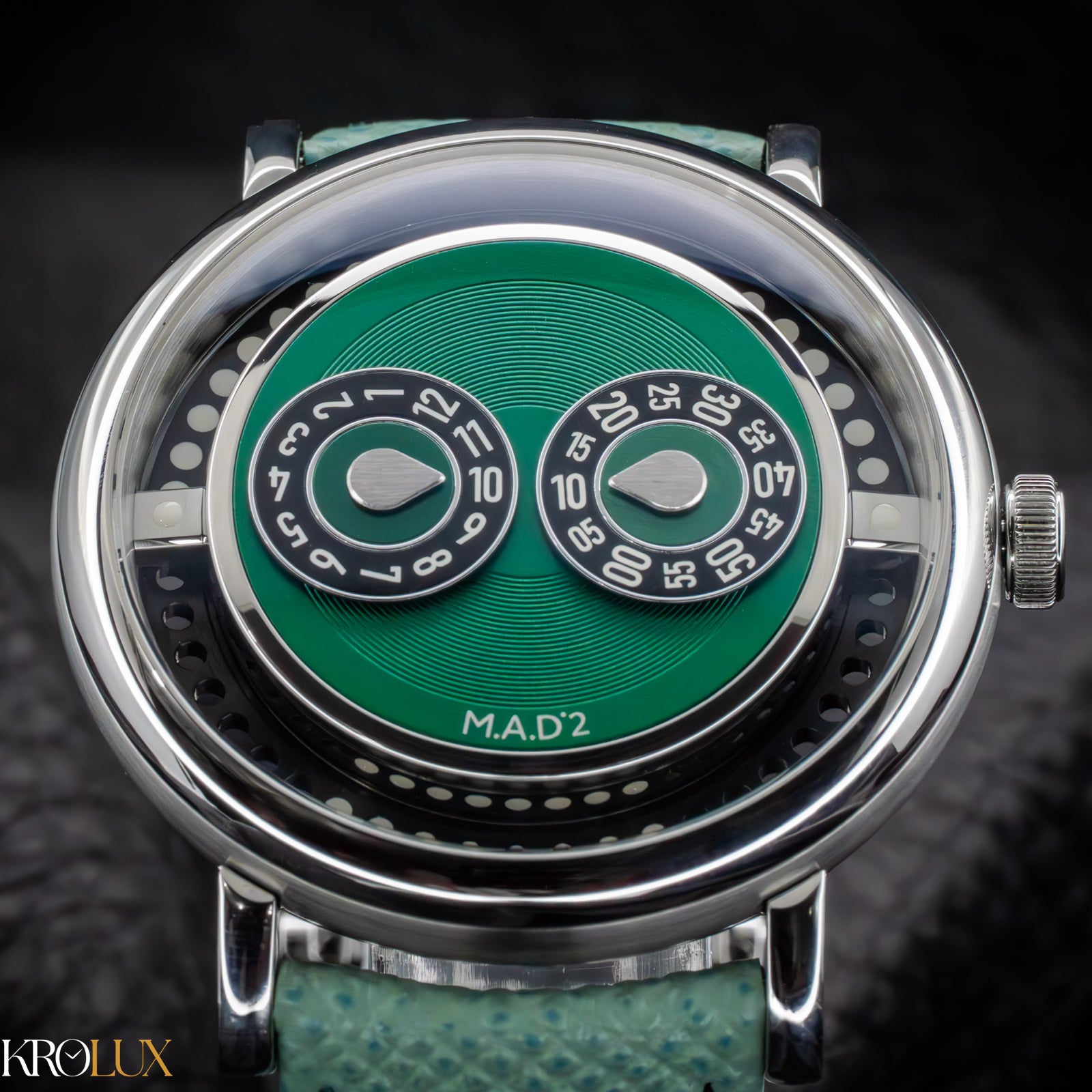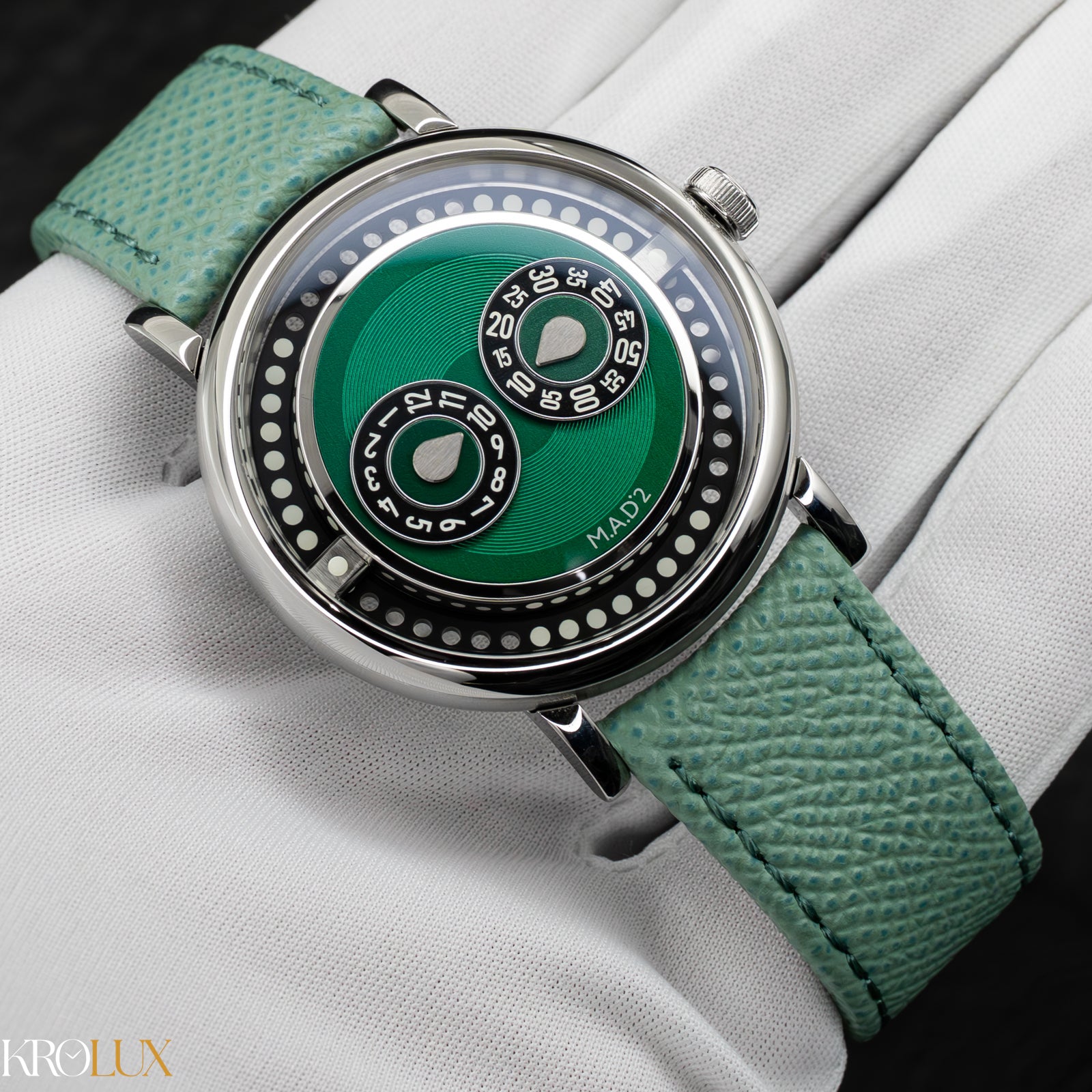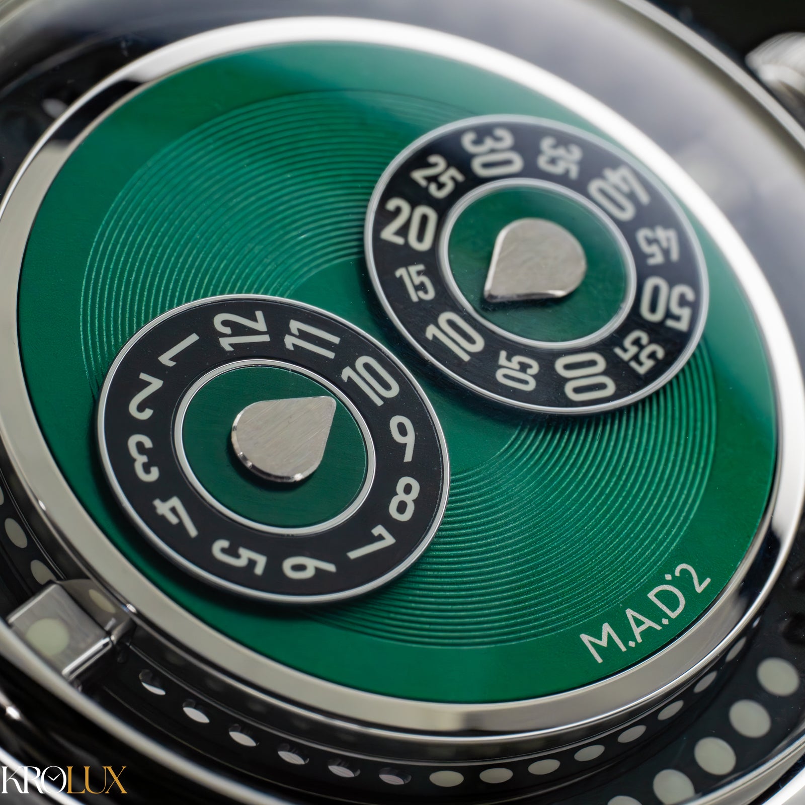 The MB&F M.A.D.2 Green Edition is playful horology brought to life. Its stainless steel case frames a striking green dial where rotating discs display the hours and minutes in a way that feels futuristic and unconventional. The bold circular pattern and twin registers create a design that is instantly recognizable, almost like a mechanical smile staring back at you.