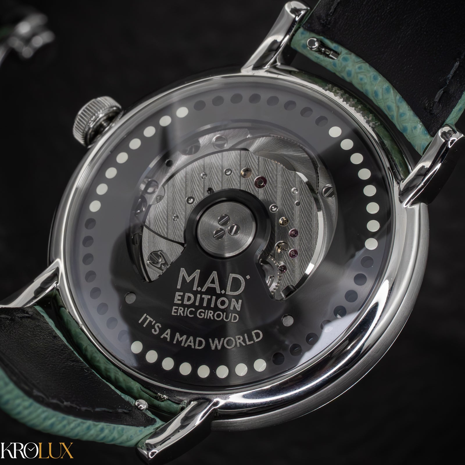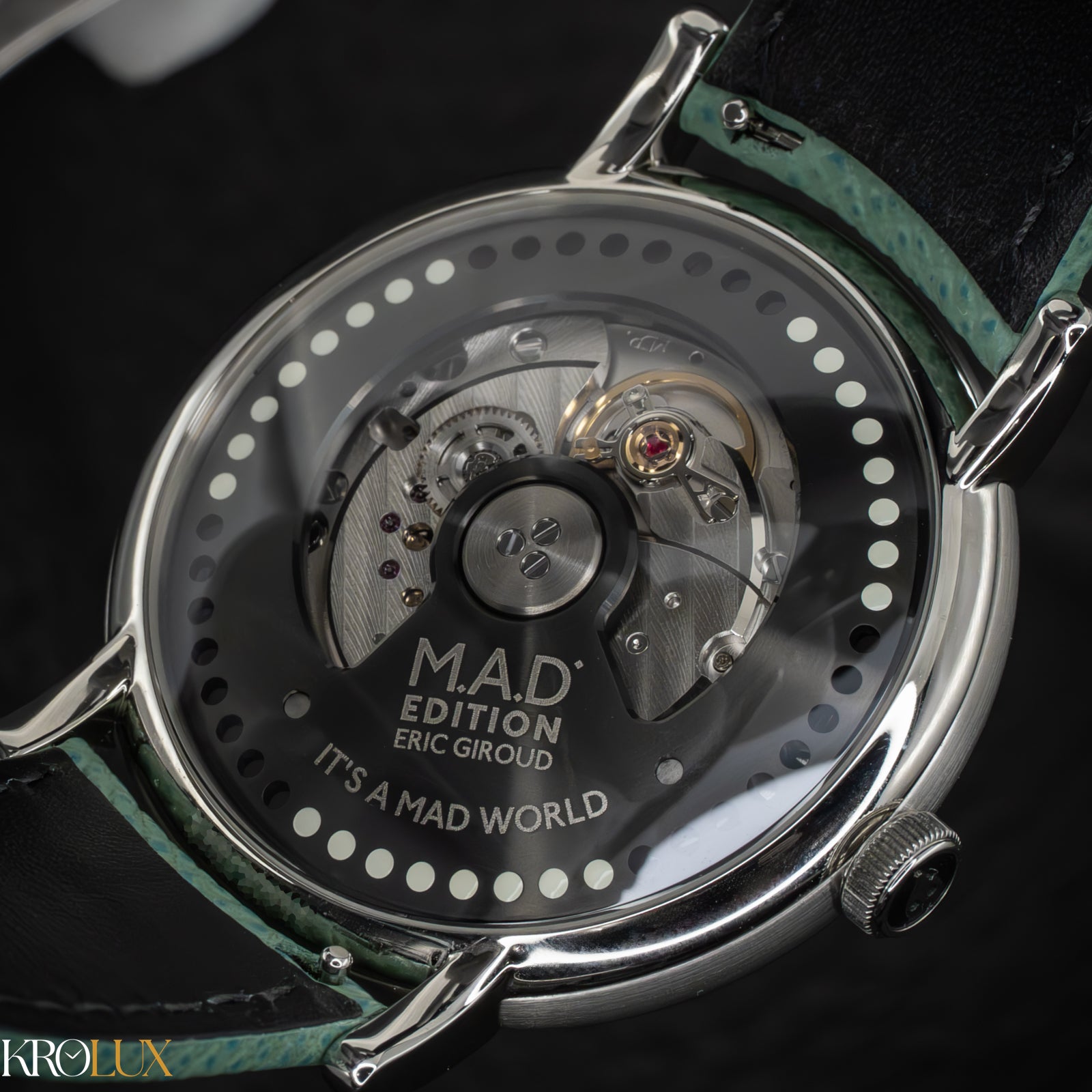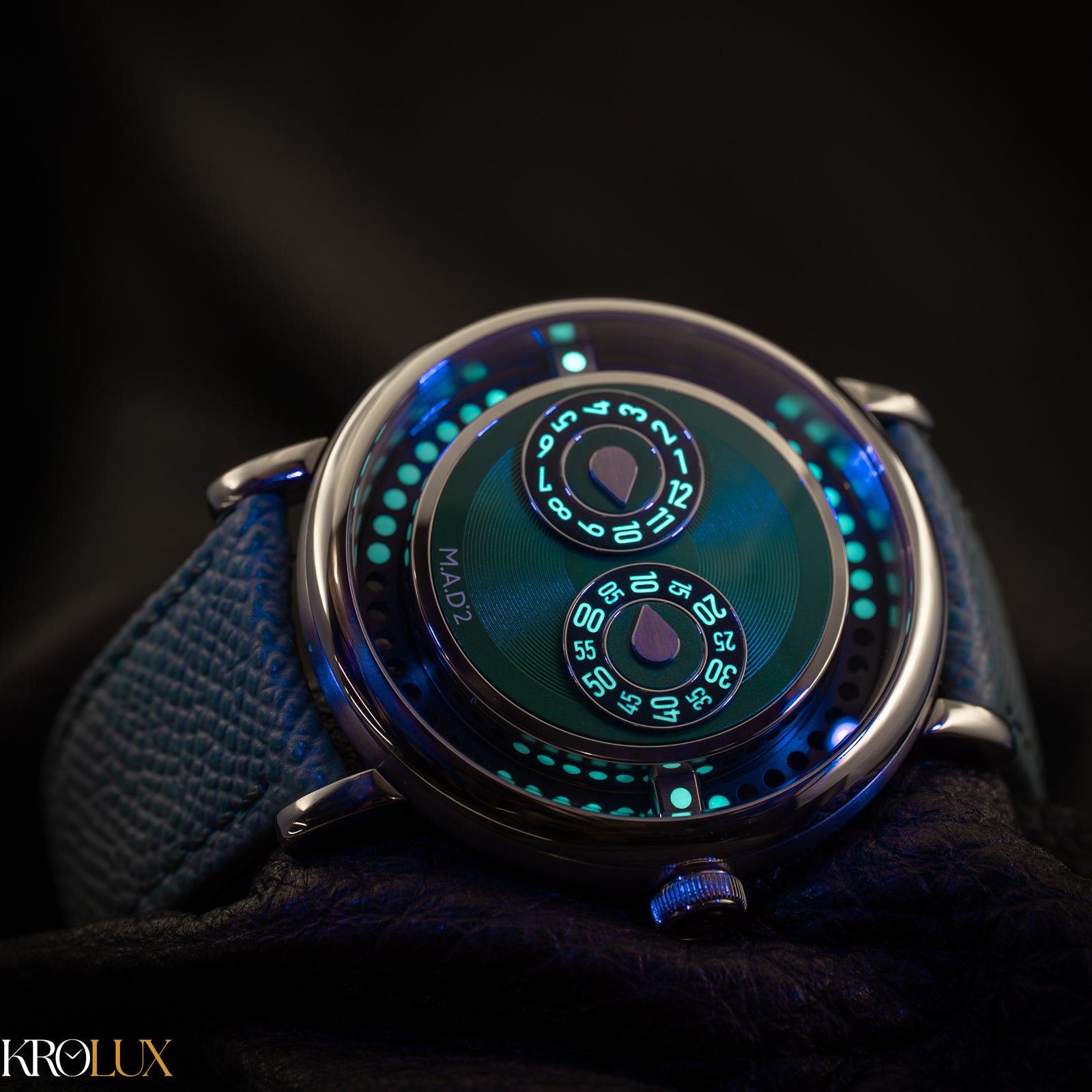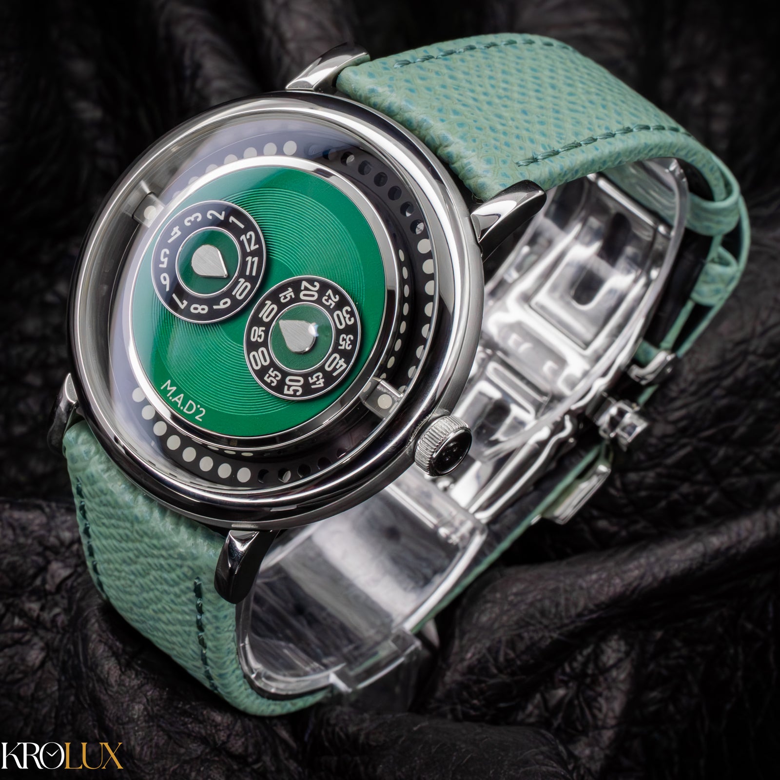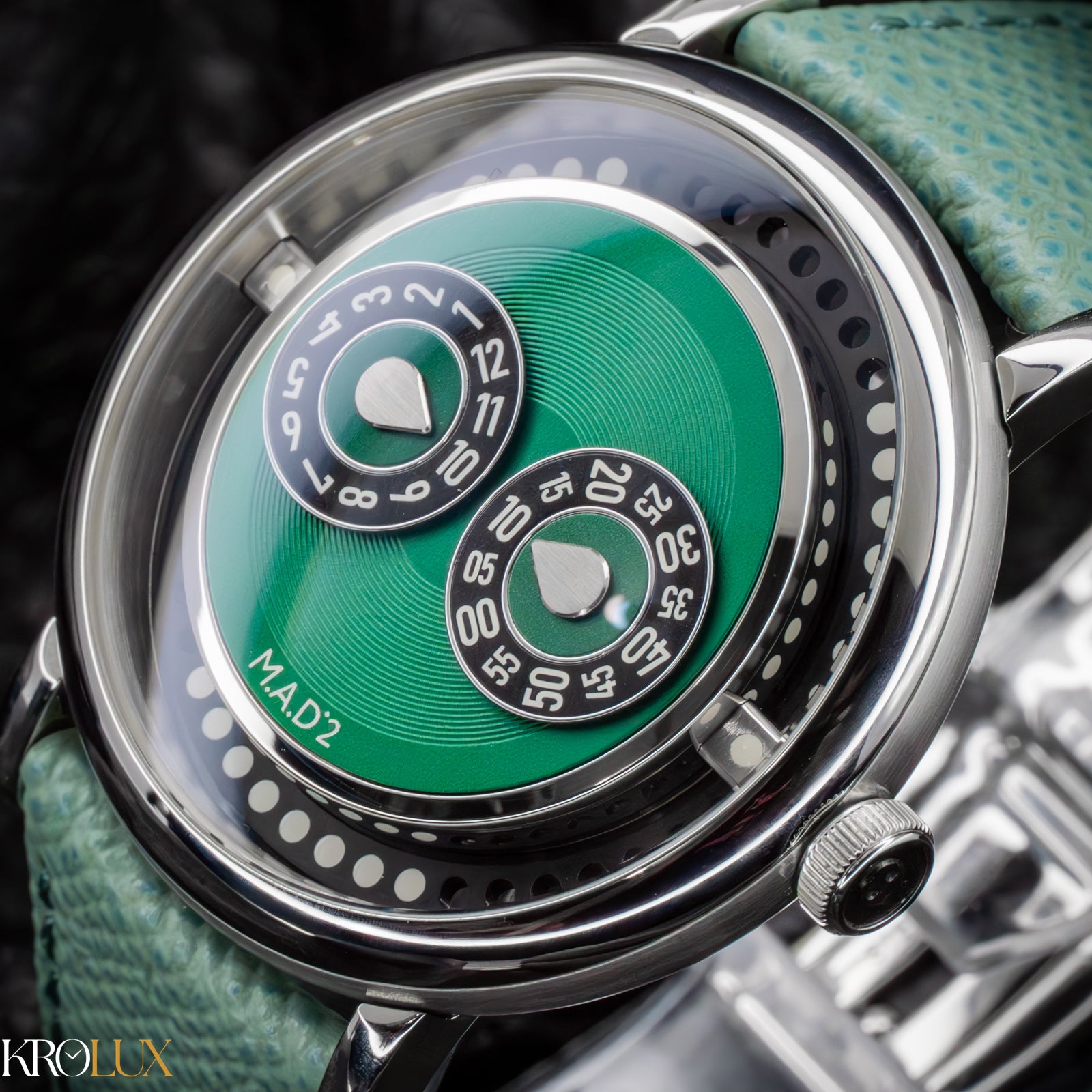 The MB&F M.A.D.2 Green Edition is playful horology brought to life. Its stainless steel case frames a striking green dial where rotating discs display the hours and minutes in a way that feels futuristic and unconventional. The bold circular pattern and twin registers create a design that is instantly recognizable, almost like a mechanical smile staring back at you.