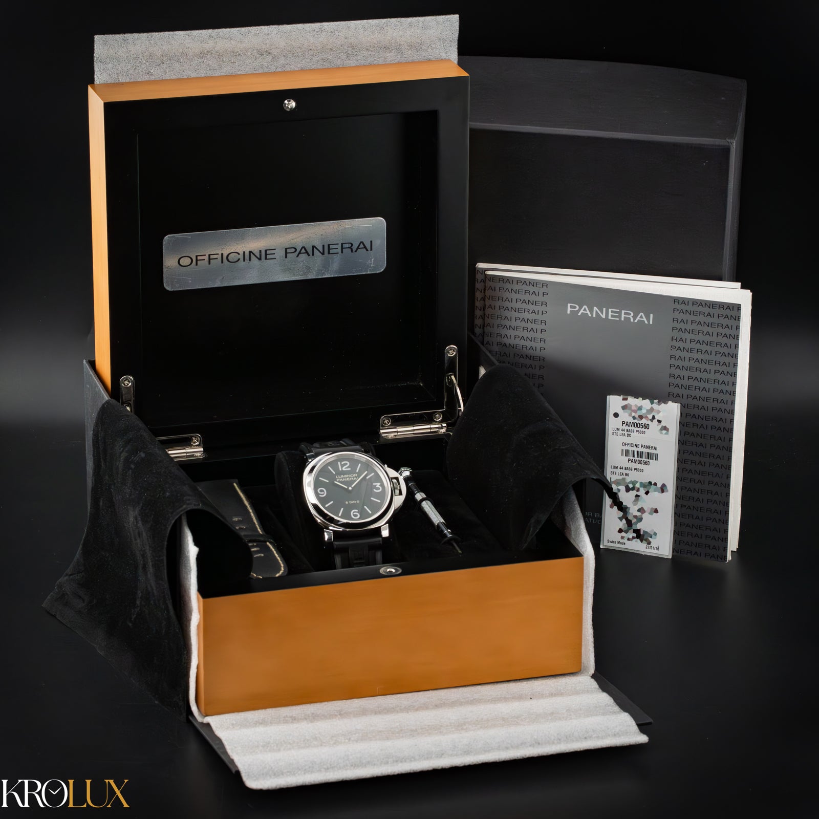 The Panerai Luminor PAM00560 is pure Panerai energy in its cleanest form. The matte black dial glows bright when the light drops, giving the watch a bold and confident presence. The signature crown guard adds strength and character, making it impossible to mistake this watch for anything else.