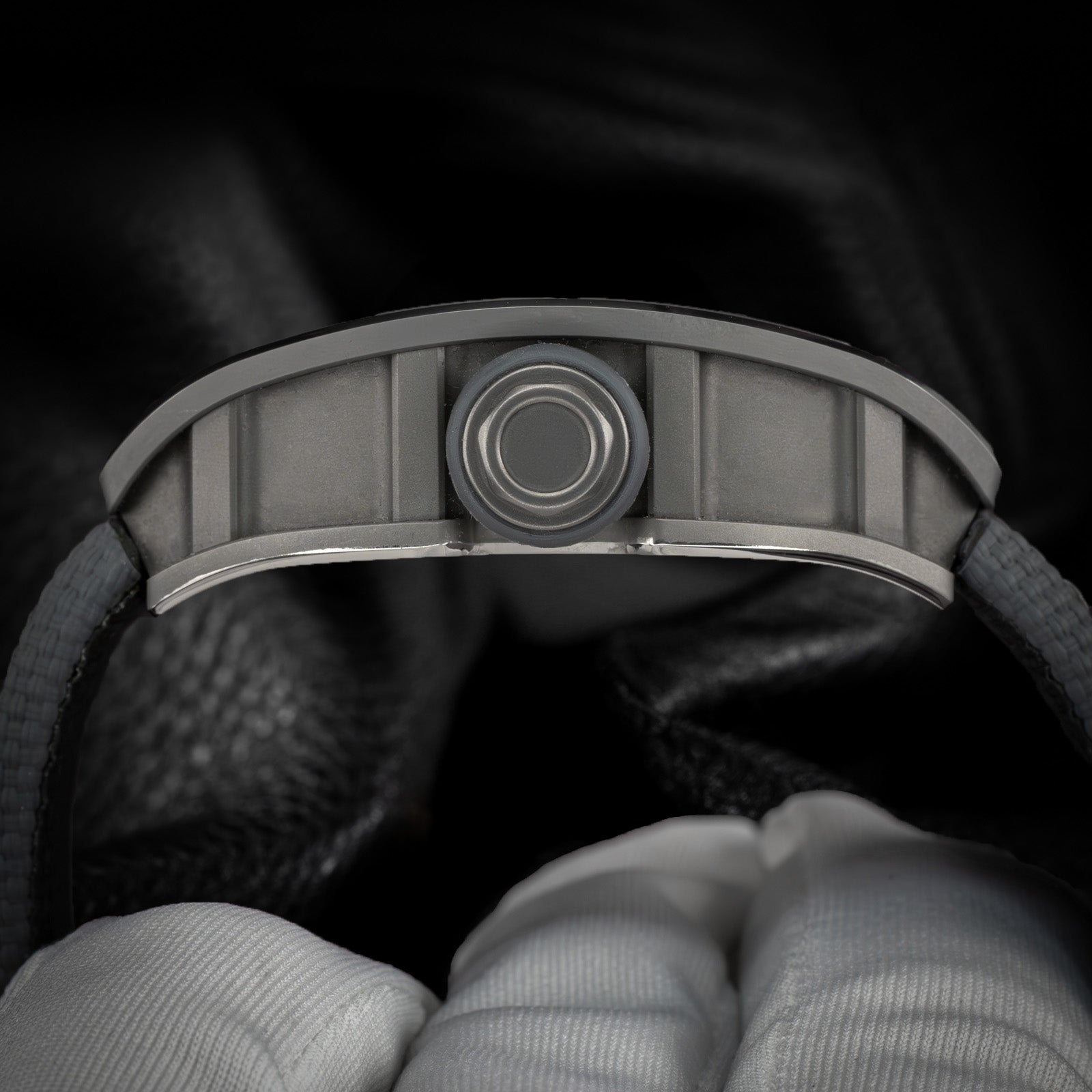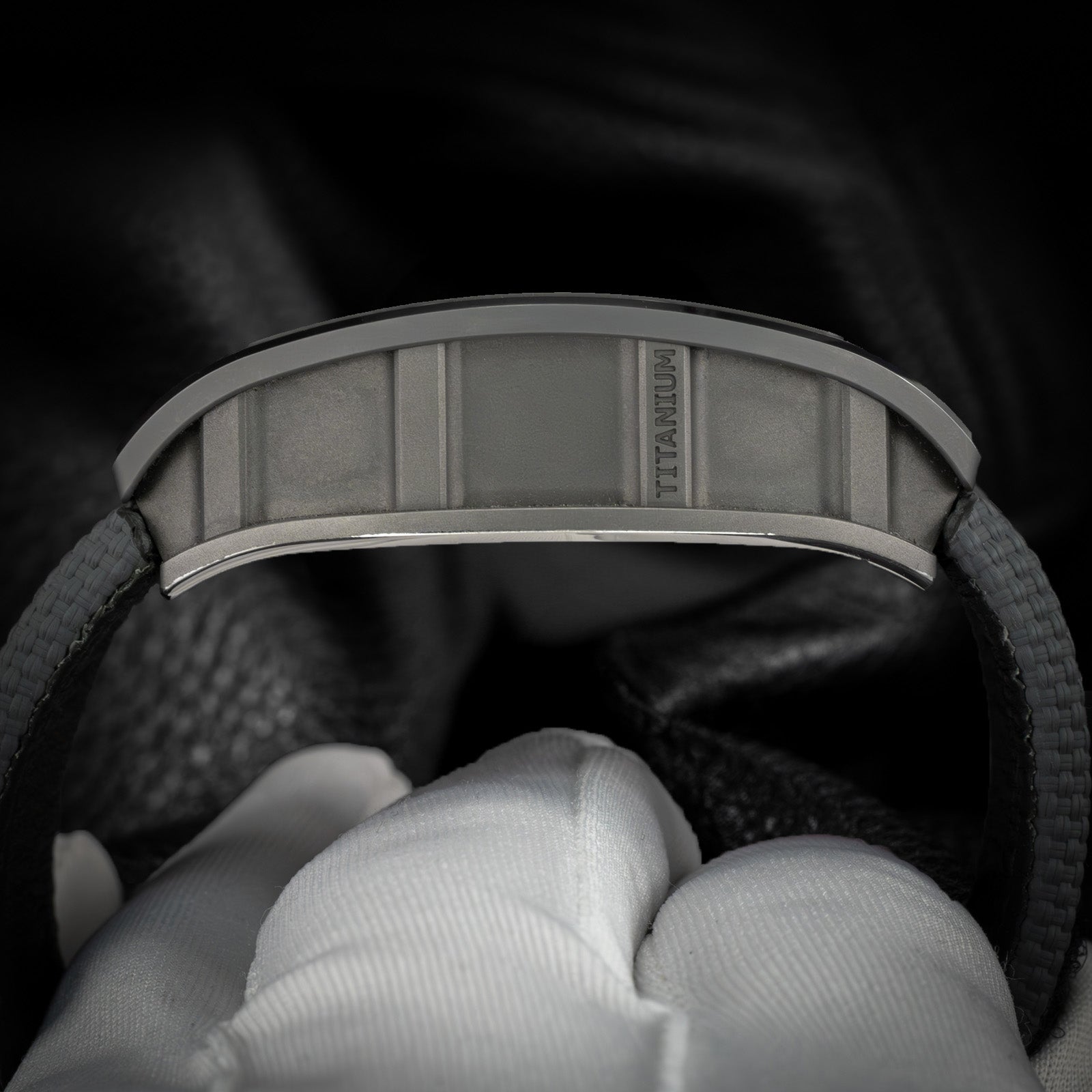 A stealthy reinterpretation of the original RM 055, the “All Grey” edition is a study in monochromatic sophistication and technical prowess. Its 42mm tonneau-shaped case combines a shot-blasted titanium carbide bezel with a grade 5 titanium caseband and caseback, all finished in a uniform matte grey that exudes understated strength.